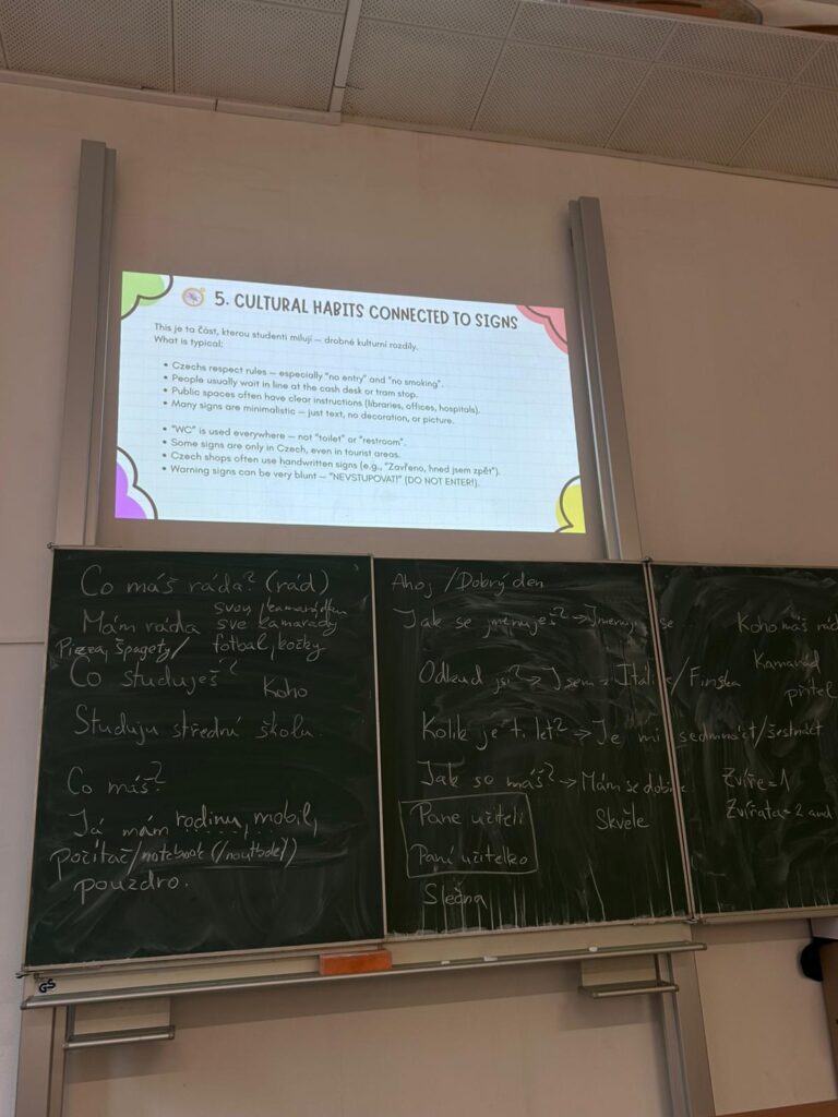 Vaihtomme aikana meille oli myös järjestetty tsekin alkeiden kurssi. Siellä opettelimme tsekin kieltä ja kulttuuria. Tunneille osallistui myös kaksi italialaista vaihtaria, ja tutustuimme heihinkin vaihtomme aikana. Tsekin tunneilla oli kiva, kun saimme lisäksi vertailla Suomen, Italian sekä Tsekin kulttuureita toisiinsa. Opimme mm. peruslauseita ja sanoja, numerot yhdestä kymmeneen, millainen on Tsekin ruokakulttuuri, tsekkiläiset perinteet ja paljon muuta. Osallistuimme matematiikan, fysiikan, englannin, tsekin kirjallisuuden, historian, tsekin alkeiden, liikunnan, kemian ja maantiedon tunneille. Lisäksi osallistuimme muutamalle saksan tunnille host-veljemme kanssa, ja muun muassa päädyimme opettamaan suomen ja ruotsin kielen alkeita luokkalaisillemme. Oli myös todella hauska nähdä, kuinka opettamamme sanat jäivät muilla mieleen, kun monet tapaamamme ihmiset tulivat käytävällä vastaan moikaten meitä suomeksi.
