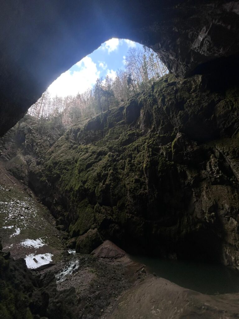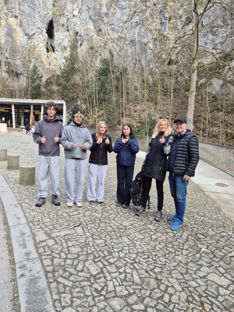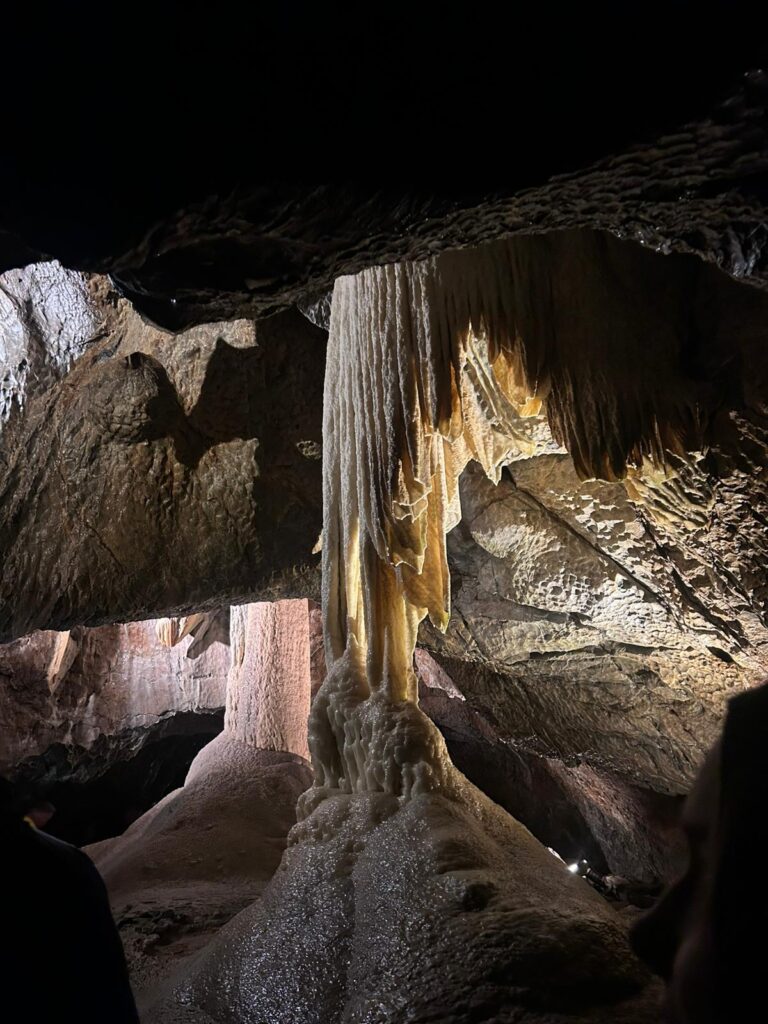 Maanantaille oli myös kivaa ohjelmaa tiedossa. Iltapäivällä suuntasimme kohti Moravský kras -nimistä luolastoa, joka on koko Tsekin merkittävin luolasto. Sinne ajomatka oli noin 40 minuuttia. Koko perhe lähti mukaan, ja lisäksi poikien serkku. Luolastossa saimme opastetun kierroksen ympäri luolastoa. Maisemat olivat mahtavat. Olimme todella hämmästyneitä, koska luolat olivat valtavia. Lisäksi kierros päättyi veneilyyn luolaston matalan kohdan läpi, ja näimme myös lepakkoja. Saimme upeita kuvia luolasta, ja pojat käänsivät kierroksen opastuksen meille englanniksi, ja saimme esitteitä ja tietoa koko paikasta ja sen historiasta. Kierros kesti noin tunnin ja sitten sen päätteeksi kävelimme autolle kauniin metsän halki, ja samalla opetimme lisää suomenkielen sanoja ja lauseita host-perheellemme. Illalla saimme maistaa tsekkiläistä perinneruokaa ja jälkiruokaa. Jälkiruoka koostui pastasta, jonka päälle ripoteltiin eräästä kasvista tehtyä jauhoa ja siihen päälle valutettiin sulaa voita. Tämä sai pastan maistumaan todella makealta. Lisäksi maistoimme tsekkiläistä suklaata ja erästä Kofola-nimistä kolajuomaa, jota ihmiset juovat kaikkialla.